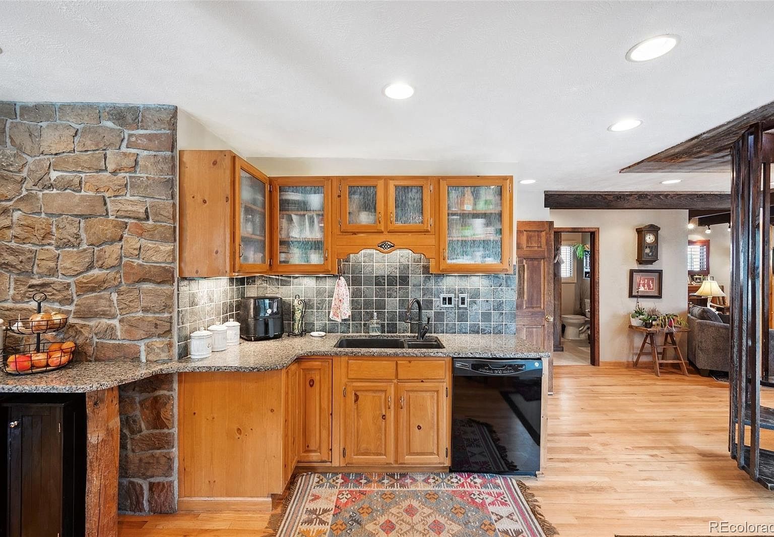 Designed for both functionality and connection, this kitchen is the heart of the home. Featuring slab granite countertops, glass-front cabinets, and quality black appliances, it's equipped for everything from morning coffee to holiday feasts. The wine cooler and thoughtful layout make entertaining a joy, while the decorative backsplash adds personality to this hardworking space.